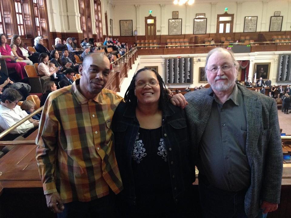 Mark Clements, Sabrina Butler, and Ron Keine stand in the House Chamber inside the Texas Capitol  Photo by Scott Cobb