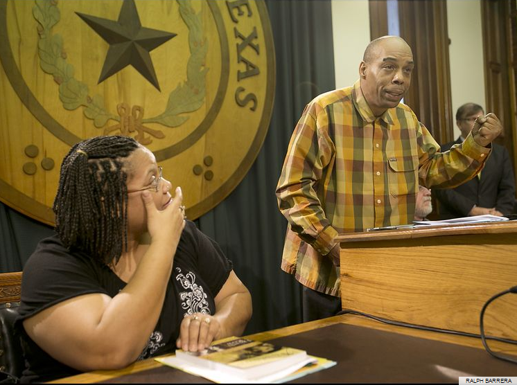 Mark Clements speaks in support of abolishing the death penalty. At left is Sabrina Butler, the only woman exonerated from death row. Photo by Ralph Barrera for the Austin American Statesman.
